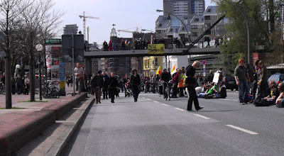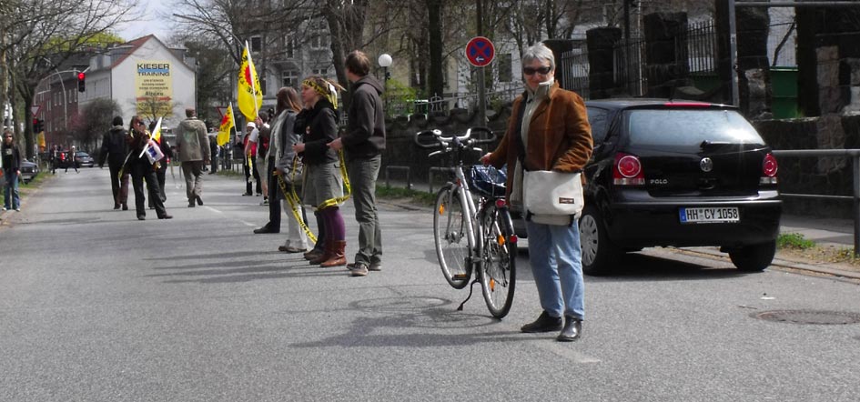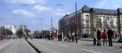 Ich fahre über den Rödingsmarkt in Richtung Innenstadt - was am Rathaus los ist, will ich mir ansehen. An einem Tag wie diesem ist an sich schon mit Touristenoverkill zu rechnen - aber heute ist der Ausnahmezustand perfekt: Die Mönckebergstraße ist eine einzige Laufmeile. Die Kette hat hier keine Löcher mehr, sie haben hier sogar gelbe Atomfässer mitgebracht, Jugendgruppen musizieren, ein Straßentheater gibt den GAU.